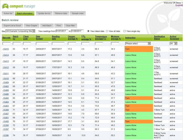 Our unique CompostManager software analyses the results, which is then simplistically presented for the whole site or for each individual windrow. Once analysed, the CompostManager system will produce a simple instruction for the composter to follow, directing the user to either `turn`, `irrigate` or `leave alone` to ensure optimal conditions in the windrow.