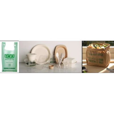 Compostable products include items such as bags, take-out containers, coffee pods, food packaging, cups, plates and serviceware.