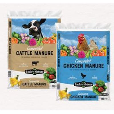 1 CU. FT. BAGS. Unlike many `bargain` manures that contain filler material, Back to Nature, Inc. Composted Cattle Manure and Composted Chicken Manure are 100% fully composted manures. They have been aerobically composted at temperatures approching 160°F for over four months. Low in moisture content and salts, Back to Nature Composted Cattle Manure and Composted Chicken Manure are virtually odor free. While cattle manure and chicken manure are natural fertilizers, they are also an important food source for beneficial soil organisms. These organisms help make nutrients available to plants, aerate the soil, and help to keep harmful organisms and pathogens in check.