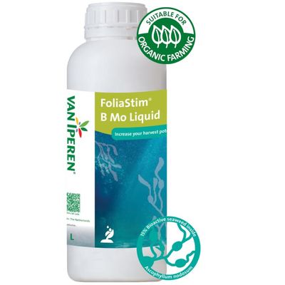 Van Iperen FoliaStim® B Mo Liquid is a pure and highly concentrated liquid Micronutrient fertilizer, formulated with 15% seaweed. Our product is a stable solution and is recommended during vegetative growth especially as of bud development, prior to flowering. The high level of Boron and Molybdenum in our formula improves cell division, cell wall formation and supports the plant to manage its Nitrogen needs. The presence of high quality seaweed supports the uptake and the transportation of nutrients and increases resistance against abiotic stress.