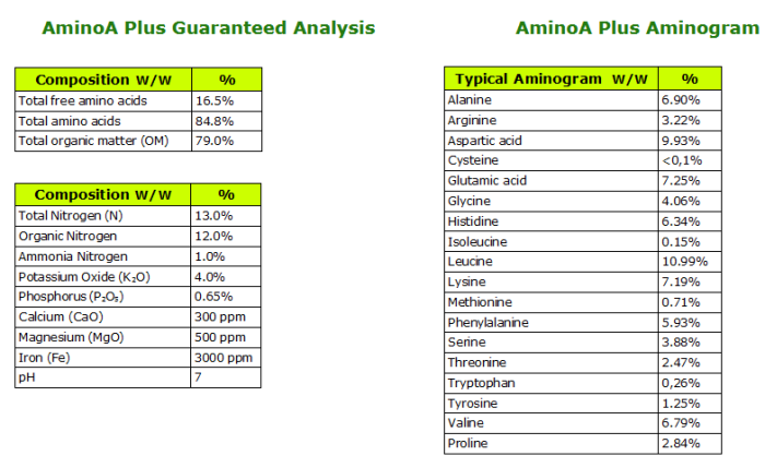 - AminoA Plus also contain 92% organic matter, 12% organic N (Nitrogen), 4% Potassium (K2O) and 440 ppm of absorbable Iron (Fe).