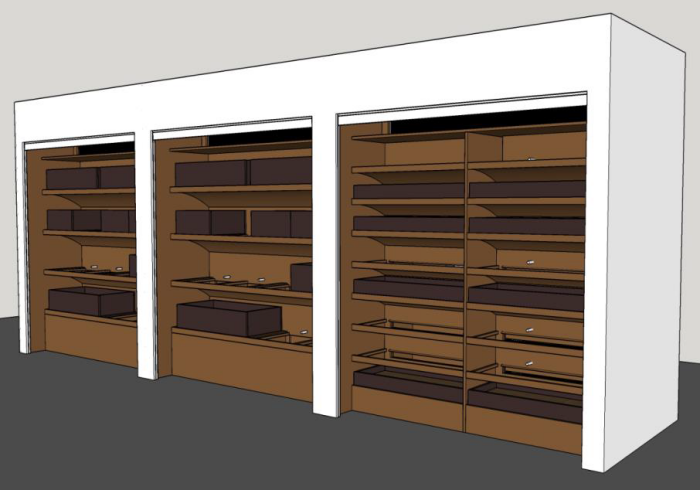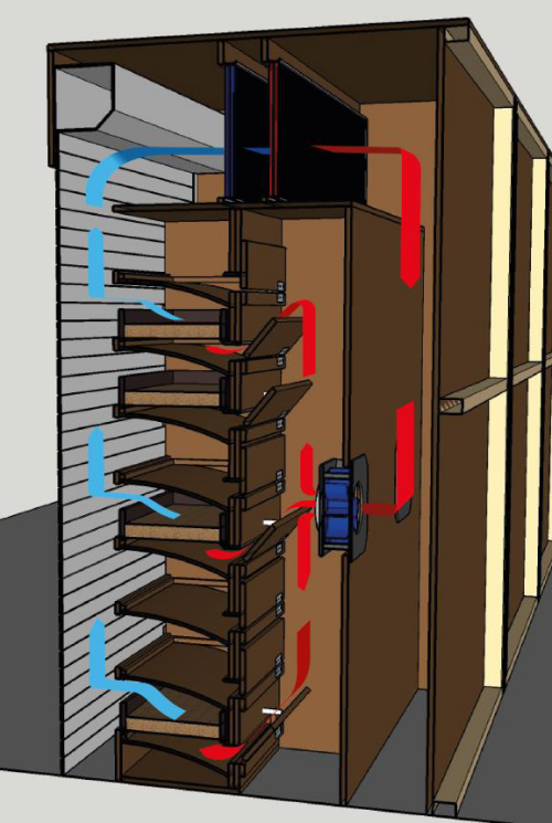 On the right a suction system: In this version the air is sucked through the seed from top to bottom through each tray or drawer. The air is then lifted upwards at the rear and sucked in again at the front through the top.
