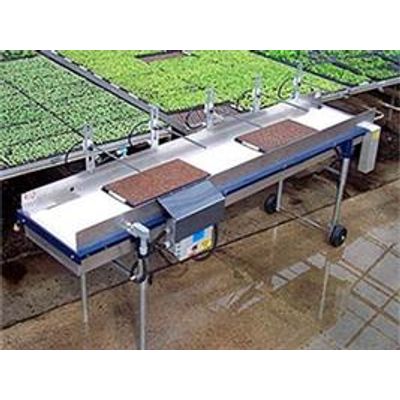 The unit’s 8-foot length makes it ideal for watering in trays behind your seeder (even at 1,000+ trays per hour on a Blackmore cylinder seeder), or using on the end of your planting or potting line. The plastic chain web conveyor is designed for long life and to prevent buildup of material on its surface.