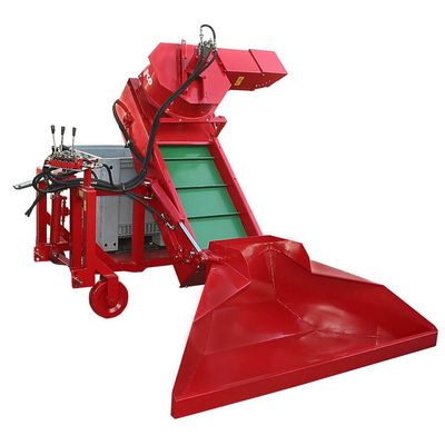 The trough is hydraulically raised, and the fruit is precisely metered to the suction blower via a conveyor belt (with a defined platform height).