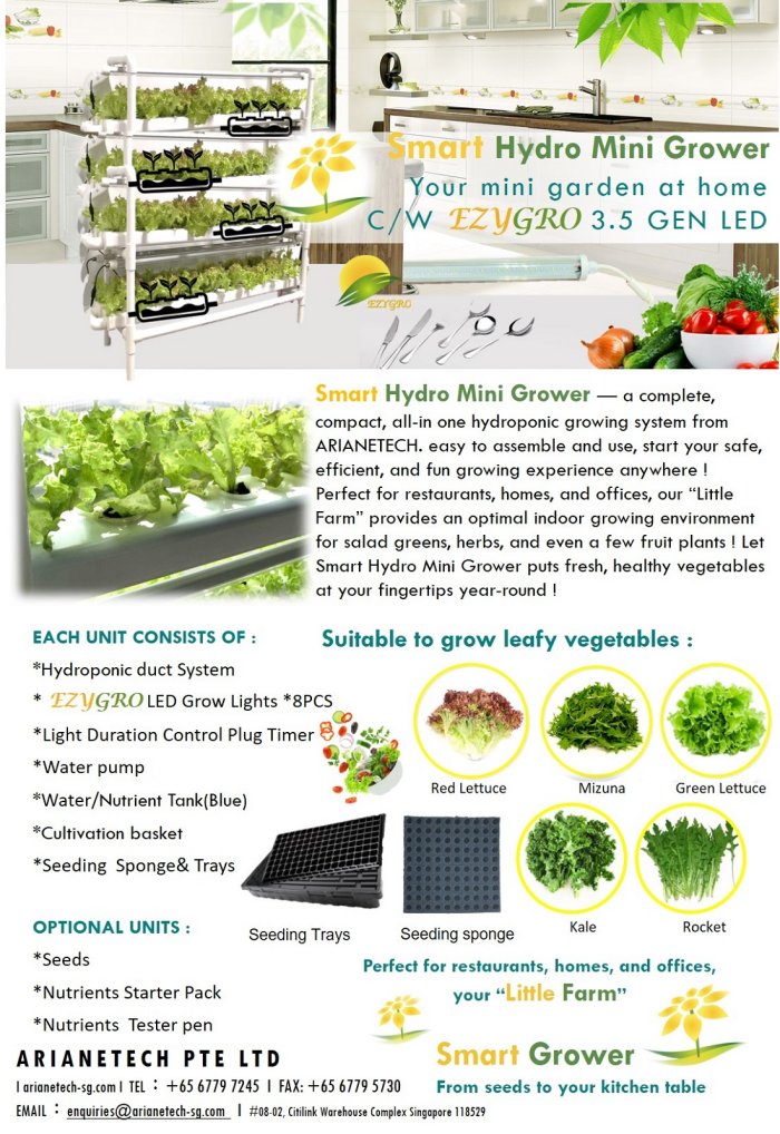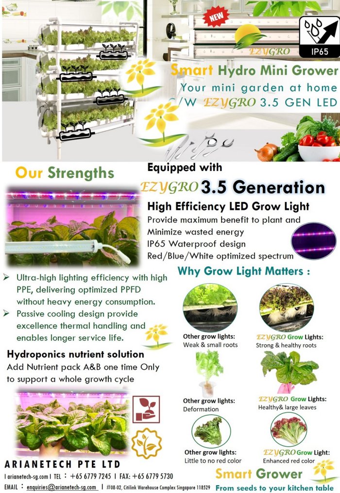 Grow with Smart Hydro Mini Grower — a complete, compact, all-inone hydroponic growing system from ARIANETECH. Ready to use when shipped, start your safe, efficient, and fun growing experience anywhere ! Equipped with 8 PCS of 3.5 Gen.EZYGRO High Efficiency LED Grow Light (worth$432) to provide best light environment for corps.Perfect for restaurants, homes, and offices.Let Smart Hydro Mini Grower puts fresh, healthy vegetables at your fingertips year-round !