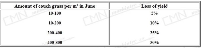 Couch grass is a greedy plant that competes with crops for light, water and nutrients and it is capable of reducing the crop yield by 30-50%. The table below shows the reduction of spring barley yield due to couch grass. Source: Landscentret planteavl, Denmark.