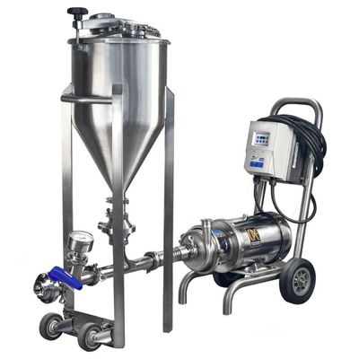 The MH-20 Hop Induction System (HIS) greatly increases the ease and safety of the dry hopping process. Attached to select centrifugal or shear pumps, the MH-20 HIS hygienically suctions hops into your beer with minimal oxygen introduction. This completely eliminates the need for scissor lifts or shaky ladders, decreasing workload and greatly increasing safety.  With the MH-20 HIS just load your hops, start your pump, turn the valve, and within minutes your hops are in the tank. We have added a pneumatic vibrator to the hopper to improve the flow of the hops and to help prevent bridging and clogs.