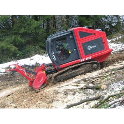 Applications: Forestry mulching, estate work, tree nurseries, landscaping, site clearance, ground preparation. Functions: Economic and efficient track mounted carrier for mulching, stump grinding and chipping. Technical Description: The RT200 is a self-propelled tracked carrier with category III linkage and PTO. The machine is powered by the fuel efficient and reliable Cat C6.6 engine with 176Hp, the machine uses Rexroth drives for smooth positive power. The operators cabin offer superb comfort with climate control, air seat and Bluetooth phone kit. The PTO is protected by a Turbo Clutch and rotates in the standard direction allowing many standard attachments to be mounted. Attachments. M500 Mulcher, S700 Stump Cutter, SF900 Stump Grinder, Crane fed chipper.