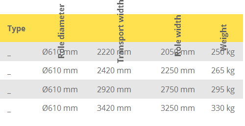 Crumble-/pressure rollers with screwable mounting and depth adjustment Roller Ø440 mm with 8 tubes (1"). Roller Ø610 mm with 11 tubes (1¼ "). Price reduction for a role without attachments (bare role)