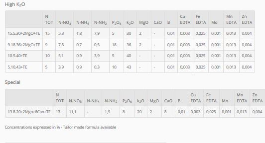 Application of AGASOL helps ensure crops obtain the correct levels of growth without excess sulphate chloride or salination. The right pH level allows this product to be quickly absorbed by crops, reducing leaching and volatilization which if not controlled can affect the performance of soluble NPK. AGASOL’s total solubility, and the free flowing structure allows the product to remain in excellent physical condition even in the toughest of environmental situations. Confezione: 10 kg, 25 kg.