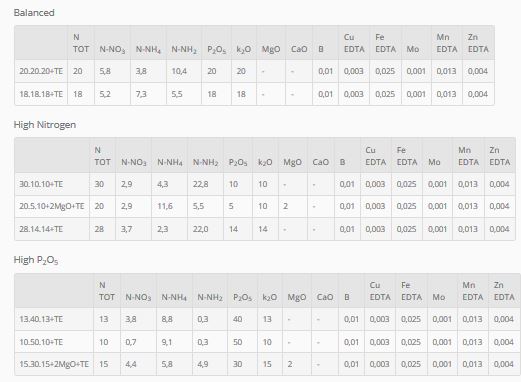 In order to allow the product to better utilize the synergy between macro and meso-elements, Agafert’s technical staff have included MgO to enable increased stimulation of chlorophyll synthesis and maximise absorption of useful metals that are fundamental during vegetative growth. The content of trace elements such as EDTA chelated within AGASOL, helps prevent and cure chlorosis and deficiencies that can affect the crop in several conditions. pH stability of the mix of trace elements allows for the complete absorption of the product itself. It is recommended to apply between 0,35 - 1 grams of AGASOL per liter of water used, while working with a stock solution is always better to maintain a ratio of around 15% - 25% of product inside. Agafert technical staff always suggest to adjust the quantity of fertilizer and water applied accordingly to the real needs of the crop.