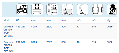 The folding tine chisel cultivator CAYMAN CB is manufactured in the working widths 4 and 5 m. with a transport width of 2,5 m. It is ideal for tractors from 160 to 320 HP. The new tine chisel cultivator CAYMAN is characterized by its versatility, ideal for mixing the residue in the top layer of the soil and for its complete interment, thanks to the 3 rows of chisels, pace 300 mm, and to its considerable height. It is supplied with TOP SPRING chisel tines (with double-spring safety system).