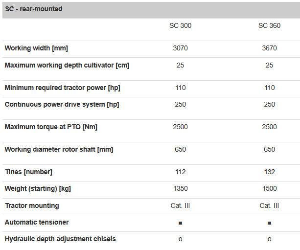 The SC series of cultivators for attachment behind a tractor can be installed quickly on the tractor and fits each model. This cultivator guarantees high, reliable performance and excels in regard to the ease of use. With its 650 mm rotor diameter, the SC series has a larger rotor diameter than most other cultivators in the same category. This makes it possible to till deeper for better growing bed preparation, yet still have a compact machine.