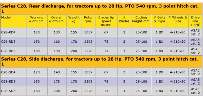 Rear or side discharge, three spindle finishing mower. 16-28 Hp (12-20 KW) 540 rpm. The optional mulching kit reduces grass residues to invisible humus.