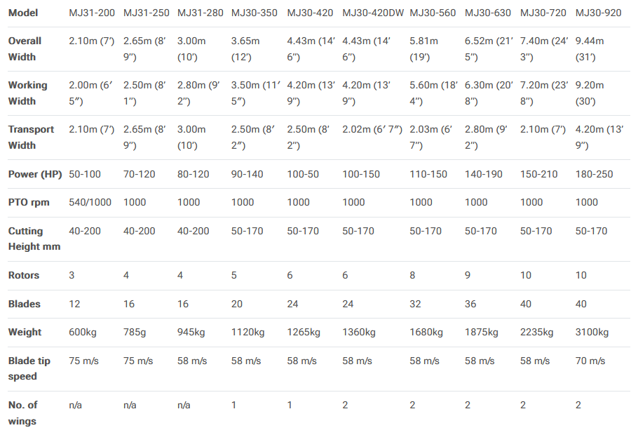 Our MJ30-920 features the same cutting excellence and power efficiency in an impressive 9.2m swathe. As little as 180hp is required to power 40 mulching blades on 10 rotors that pulverises all types of vegetation without clumping.  Wings hydraulically fold up to 4.2m width for safe road transport. Heavy duty caster wheels can be fixed or swivelling depending on the application.