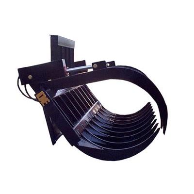The Hydraulic Skid Steer Rake has the same general specifications as the Stacking/Root Rake. The hydraulic arms are two 2500 P.S.I. cylinders for heavy duty lifting, stacking, and loading. The separate arms work independently to adjust to various clamping situations.