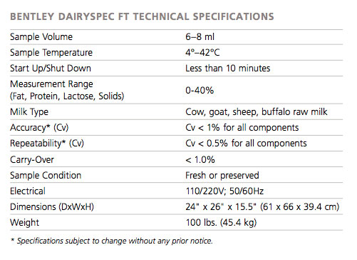 The DairySpec FT is designed for a wide range of dairy laboratories and processing facilities that need a highly accurate instrument for the analysis of dairy components, including Fat, Protein and Lactose. Engineered in accordance with Bentley Instruments’ rigorous design principles and quality management systems, the DairySpec FT provides precise and accurate measurements, as well as exceptional reliability. Bentley Instruments DairySpec FT component analyzer uses an industrial Fourier Transform Spectrometer (or FTIR) that captures the complete infrared absorption spectrum of the milk sample for component analysis. Collecting the complete spectrum allows the calibration to be based on all spectral characteristics of each particular component. The infrared spectrum is permanently stored so that at any time in the future other calibrations may be retroactively applied to your data.