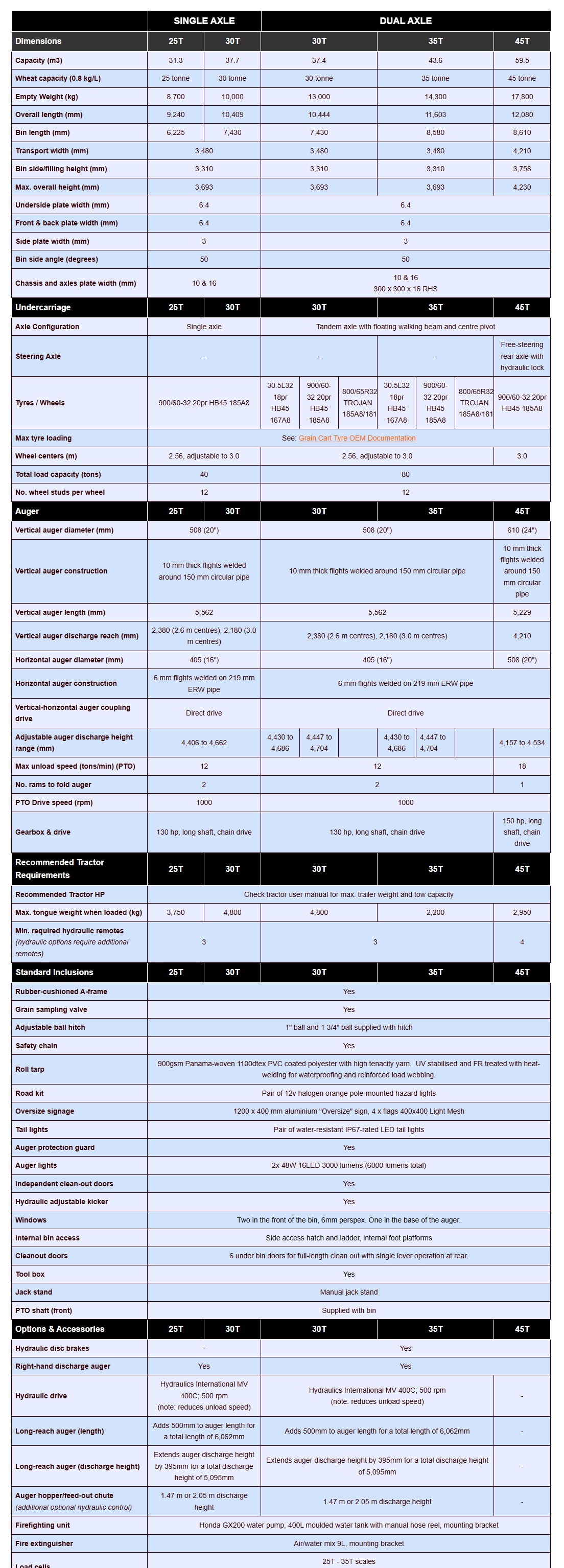 Our 25T & 30T single-axle models feature a 20" (508 mm) diameter single-fold design with 10 mm thick flights welded around 150 mm pipe for super fast unload performance.