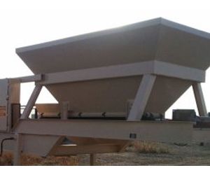 A 12 foot by 7 foot bin only 6 feet deep with a 60 degree side slope. A 4 inch grate mounted on top keep frozen chunk from plugging the feed belt. A 24 inch wide belt with a 10 inch lagged head pulley for sure flow is controlled by a 3 hp ac motor and a variable frequency provides for a wide range of feed ratios for better temp control. A self-cleaning tail pulley with manual adjustment on take up bearings is provided.