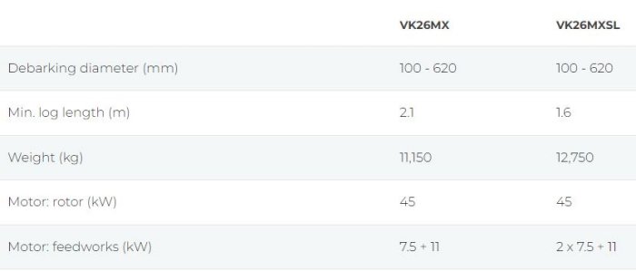 The VK26MX is a specialized debarker designed by Valon Kone for production plants that demand a lower feed speed. It has gained enduring popularity due to its reliability and user-friendly operation, ensuring consistently high-quality debarking results at minimal operating costs. Featuring feedrolls with replaceable FibreMax inserts, the VK26MX allows for straightforward maintenance and adaptability to varying conditions with different insert types available to maintain optimal grip. This makes the VK26MX an excellent choice for operators seeking efficiency and longevity in their debarking processes.