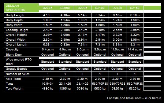 The Delilah Manure Spreader is a heavy duty spreader designed to handle all types of manures, FYM, semisolid, poultry litter, industrial sludges, composts, waste products etc. The unique design of the rotor and blade pattern allows you to spread all types of manures without the trouble and fuss of changing spreader decks. Based on years of spreading experience the latest rotor design and blade pattern on the Delilah allows you to achieve accurate spreading rates and the variable floor speed control allows you to choose your application rate and with the option of monitoring equipment you can be sure that your application rates are exactly as you expect. Trouble free running The Delilah has top quality bearings, bearing assemblies and bushings with easy access grease points, so your Delilah keeps working with minimal down time and the electronically balanced spreading rotors eliminate vibration during operation.