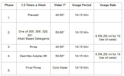 Phosphoric and Nitric acid based, nitrate free, disinfectant used to remove lime stains from CIP systems. Usage dosage is 0,5%. Cleaning of Portable Milking Machines: We recommend that the operator washes each milking cluster with 10 liters of water, and then washes with Alkali based detergent and rinse again. After washing 4- 5 times with alkali based cleaners, dilute 50ml of Dezinfex Aciplex 96 per 10 liters of water, circulate 2 – 3 times. Then rinse with cold water.