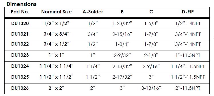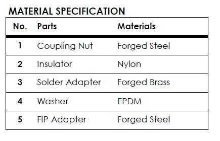 Galvanized x Brass. Maximum working water pressure: 250 PSI. Maximum working water temperature: 210˚F. Thread connections: ANSI B1.20.1. Copper connections: ANSI B16.18. Available in sizes: 1/2” - 2”. IAMPO/UPC-NSF 61.4/AB1953 listed