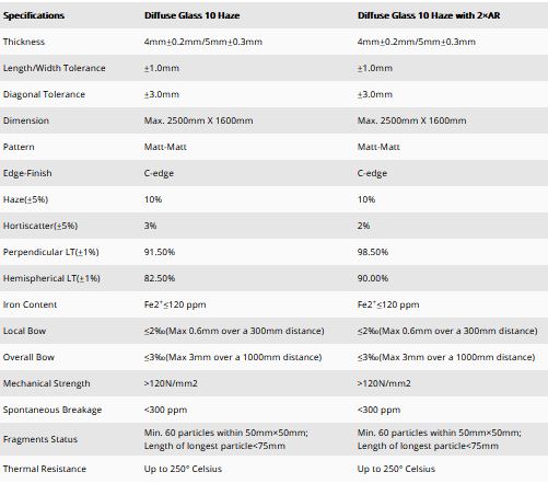 - With low-iron base (<120ppmFe2O) and leading etching AR technology, our glass has the highest light transmission standard in the world: For diffuse glass: ≥91.5±0.5%; For diffuse glass without 2×AR: ≥97.5±0.5%, 98.5% in average