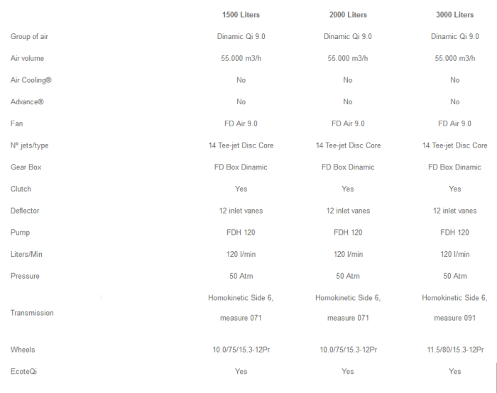 Group of air : Dinamic Qi 9.0. Air volume : 66.000 m3/h. Air Cooling : No. Advance : No. Fan : FD Air 9.0. N° jets/type : 14 Tee-jet Disc Core. Gear Box : FD Box Dinamic. Clutch : Yes. Deflector : 12 inlet vanes. Pump : FDH 120. Liters/Min : 120 l/min. Pressure : 50 Atm. Transmission : Homokinetic Side 6, measure 071. Wheels : 10.0/80.12-10Pr. EcoteQi : Yes.