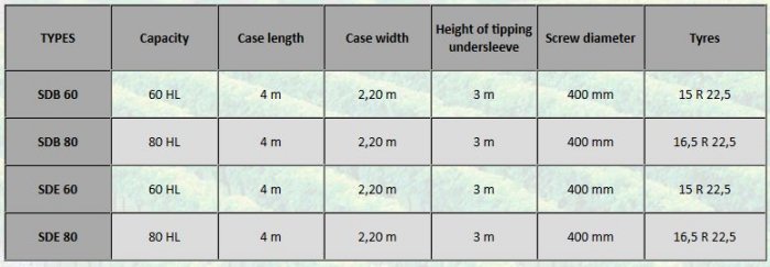 Screw diameter 400 mm with hydraulic drive and output divider, Coned rear spout with door hydraulic control, Adjustable spring towing tongue, Watertight cover steam-powered by 2 jacks double effect, Alimentary covering, Hydraulic braking, Hydraulic stand, Mudguard avoiding splashing, Front ladder.