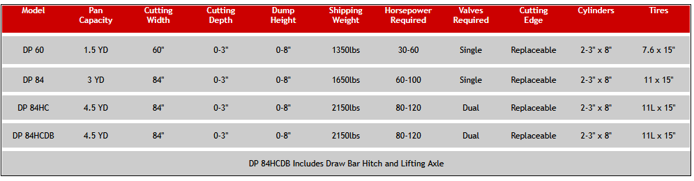 The Dirt Pan attached to the three point lift of a tractor is intended to be used in landscaping, agriculture, and light construction. The unit provides an efficient means of scooping, lifting, and moving soil between points without dragging the soil. Variable cutting depth is controlled by the tractor`s three point lift. Variable dig angle and dump height are hydraulically controlled by the tractor`s single remote valve. Digging, dumping, and transport accomplished without stopping tractor.