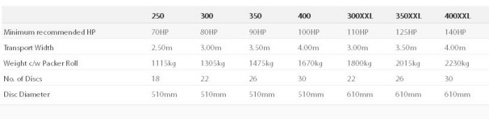 Multidisc - Heavy Duty : 510mm disc diameter. Multidisc XXL - Very Heavy Duty : 610mm disc diameter. Models rated from 70HP upwards / Category 2 & 3 linkage . Available with optional Polymat Compact Pneumatic Drill. Hydraulic folding options available up to 12m