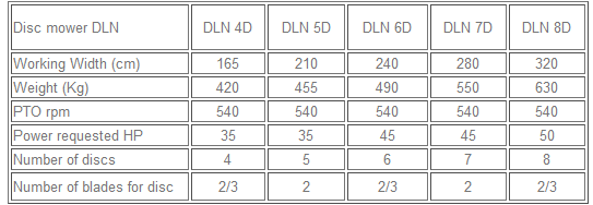 Side discs rotary mower DLN is available in versions with 4, 5, 6, 7 and 8 discs (+ versionDLN 3D) to satisfy any requirement relating to extensions of the work areas and tractors of all sizes.