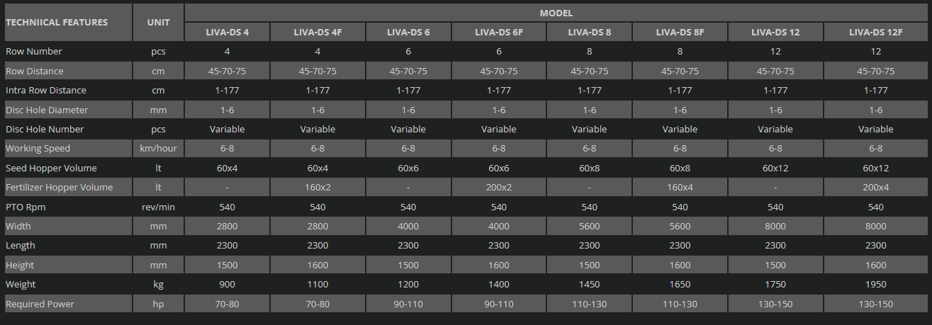 One of latest generation Liva Pneumatic Planters allow seed to be sowed precisely in the desired sowing range and intra-row distance. It is manufactured with 4-6-8-12 rows optionally. Seed bed is opened with the help of discs in sowing units. Each sowing unit consists of 2 discs made of special material. It can operate in fields with processed or semi-processed stem remains thanks to cutter discs that can be attached to front side of chassis and disc type sowing units. Because movement obtained from wheel is transmitted to sowing units by shaft mechanism, precision sowing can be performed in intra-row distances.
