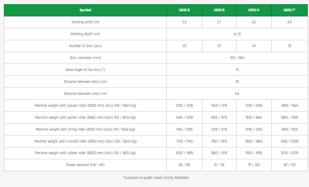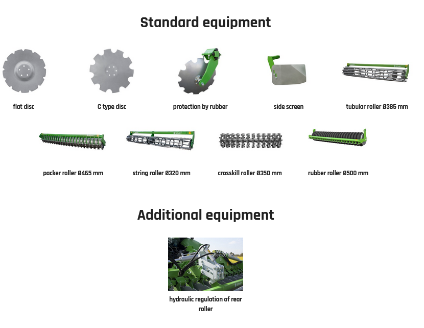 Tilling and sowing sets are equipped with a universal supporting frame, on which a compact 2-row disc harrow and a roller are mounted. The compact disc harrow consists of two beams with toothed discs (flat or C type) with a diameter of 510 mm and 560 mm with a rake angle of 15˚. In addition, the unit is equipped with side screens that limit the rejection of the soil by the extreme discs of the front and rear sections. Working depth operation is determined by adjusting rear roller in the range to 12 cm.