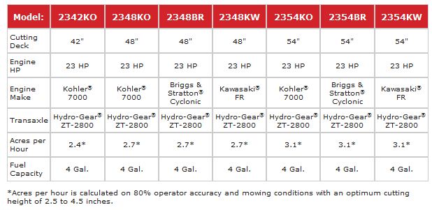 - High Horsepower – A 23 horsepower engine from Briggs & Stratton®, Kawasaki®, or Kohler® to power you at up to 3.1 acres per hour.