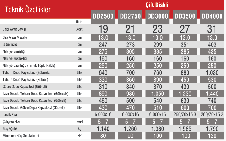 Double disc planter feet should be used in cases where there is a lot of straw in the field. The roller wheels behind the feet press the soil and ensure that the seed is thoroughly covered. It allows the seeds to be thrown into the soil evenly and in the desired amount with the help of stepless transmission and planter seed gears. Fertilizer dispersion in the machines is provided by slotted roller gears with the help of a stepless transmission. The distance between rows in double disc foot machines is 130 mm. This type of machines are manufactured with or without fertilizer in 19, 21, 23, 27, 31 rows.