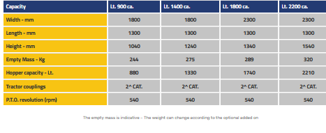 Standard equipment: Safety grid – C.E. standard - STAINLESS STEEL. Tilting hopper dim./mm. 1800x1300 - STAINLESS STEEL. High strenght frame - STAINLESS STEEL. Hopper swift connection kit - STAINLESS STEEL. Tilting and support crossbar - STAINLESS STEEL. Rotating parts safety protection against working accidents (CE) - STAINLESS STEEL. Dosing equipment with truncatedcone shape cups and side shutters - STAINLESS STEEL. Distributor disks with adjustable inclination blades - STAINLESS STEEL. Back offset levers adjusting fertilizer falling - STAINLESS . STEEL. Mixers for grained fertilizers - STAINLESS STEEL. High strength frame - STAINLESS STEEL. Protection shield / Carter with mudflaps - STAINLESS STEEL. Tilting studs, lifting stud and top link stud. Nuts, bolts and fasteners – STAINLESS STEEL. PTO shaft with couple limiter and protection.