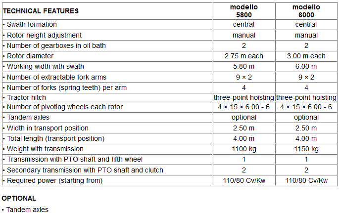 The correct working position and machine balance are found by adjusting the height of the tractor hoisting device and the third point position in order to let the teeth pass just over the ground. During the maneuvers at field head just lift both rotors without modifying the height of the hoisting device. You will always obtain homogeneous adjustments. The gearboxes in oil bath are maintenance-free. The axles with two pivoting wheels adapt to the ground very well (tandem axles upon request).