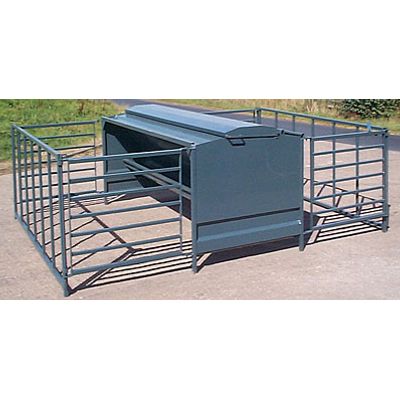 10 feet wide with creep gates and wings which fold onto the hopper for transport. Gates can be removed to make an ad-lib hopper. 1 tonne capacity. Easy to fill. 20 feet of feeding space. All the bulk feeders are 10 feet wide so that there is no spillage when using an 8ft wide bucket. they have a flap on the lid to guide the food into the hopper and all hoppers have adjustable slides to regulate the flow of feed into the trough. Alternative sizes of feeder can be made to order.