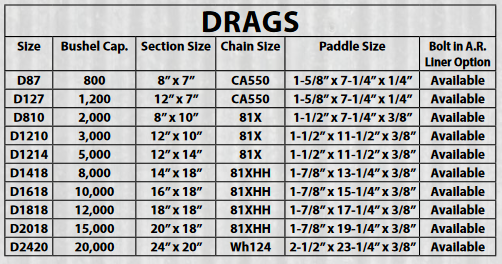 Size Bushel Cap.: 800. Section Size: 8” x 7”. Chain Size: CA550 . Paddle Size: 1-5/8” x 7-1/4” x 1/4”. Bolt in A.R. Liner Option:  Available.