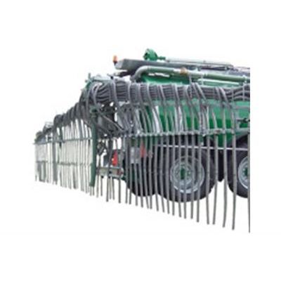 The SB drip hose booms from 12 to 24 m working widths. These booms have 1 distributor. They are available either with a fixed working width or as combi booms with adjustable width. Drip hose booms have a master/slave cylinder system which ensures that the boom folds in and out at the same time. The SlurryMaster 6000 ensures automatic and intelligent control of all hydraulic functions when starting and stopping the spreading – the driver only has to activate one button. The drip hose booms are fully galvanised and built with a trapezium suspension which ensures that the boom always follows the surface of the ground, even on hills. The boom is raised and lowered hydraulically, and when the boom is folded along the sides of the slurry tanker during transportation, it is inclined, so that the slurry runs back to the distributor and does not drip from the hoses.
