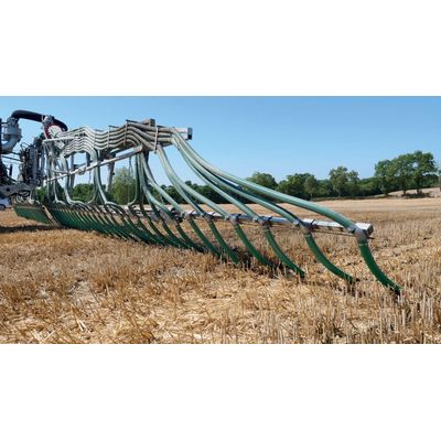 Using a drip hose boom enables you to properly apply slurry onto the soil surface, increasing nitrogen’s efficiency. Spreading the slurry as close as possible to the crop base significantly reduces odour. Spreading liquid organic fertiliser on growing crops at maximum working widths is now possible thanks to our range of standard and telescopic booms. Placing the hose ends against the ground surface guarantees better nitrogen use and prevents your crops from getting dirty. The small distance between each hose allows a very uniform volume to be spread over the entire width. Using a drip hose boom significantly reduces nitrogen loss through volatilisation. Use precision spreading implements to apply your organic fertilisers accurately on growing crops. Width: 9 to 30 m.