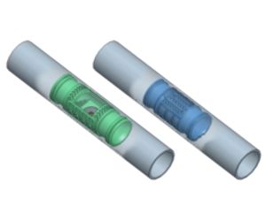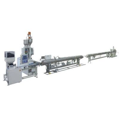 The above video shows the complete manufacturing line for producing drip irrigation pipe with inline round drippers. First the cylindrical emitters are oriented in a single file linear fashion and fed into the molten irrigation pipe at a specific spacing determined by the operator interface on the inserting machine. When the drippers are inserted into the polyethelene (PE) pipe they bond with the inner surface of the pipe. The pipe is first fed through a vacuum/cooling chamber and then through a second cooling chamber in order to solidify the pipe. The pipe then travels through the high speed dripper perforating (drilling) device capable of drilling 300+ drippers per minute which drills 2 or 4 water outlets on each dripper. The pipe is then cut in coil lengths determined on the operator interface of the inserting machine and coiled in an (optional) automatic coiling machine.