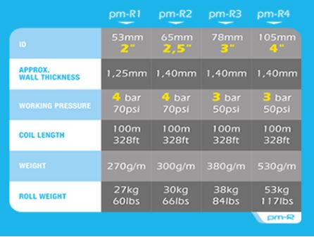 Stnd. length: 100 Mt/328 Ft. Per Coil (Special order for longer lengths). Temp. range: -20 to + 70°C. When Temperature is -15°C and Colder, please DO NOT Handle or Transport Hoses. Construction: 3-Ply Polyester Yarns. Both tube and cover are extruded simultaneously to obtain maximum bonding. Caution: For liability purposes, if temperature exceeds 45°C the working pressure will go down. Please check wlth factory to ensure sufficient safety factor. Colour: blue.