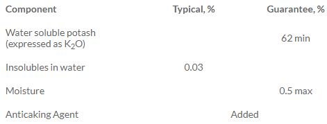 One of the most concentrated sources of potassium. Suitable for use on all soil types for all chloride tolerant crops. Safe for irrigation systems. Compatible with all types of water soluble fertilizers. High chemical purity. 100% solubility in water. No dust. 100% friability.