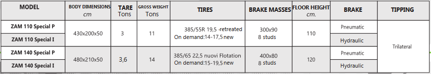 Standard equipment: Front driving axle. Self-steering rear axle. Cantilever leaf spring suspensions. Up-chequered metal-sheet floor. Rear columns. Downwards/upwards opening of the rear side. Extension sides attachments. N.4 front tubes diam.90. N.4 rear pole-holder tubes diam.90 inner side. N.4 lateral pole-holder tubes diam.90.