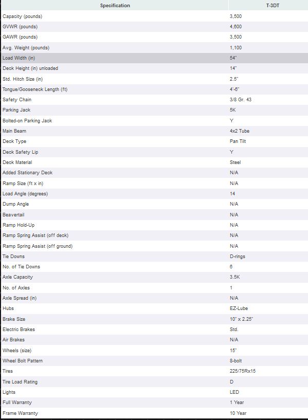 The T-3DT trailer is a pan type tilt deck and is designed for hauling small equipment and short loads of sand, rock or debris. The deck features a slip-resistant texture and 8-inch high sides. The low deck height is perfect for a low load angle and the slip-resistant deck assists in equipment loading. The T-3DT features a rubber-ride axle for a smooth ride, electric brakes, an adjustable hitch, and a positive locking (over-center) latch system to keep the deck secured to the frame.