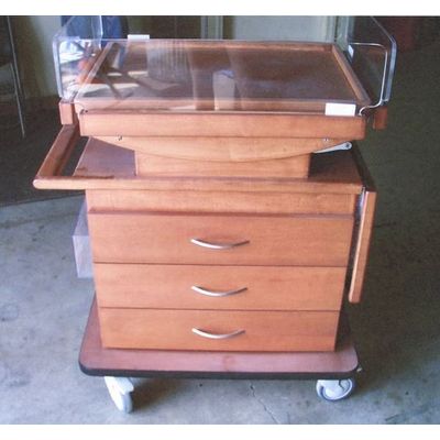 This three drawer Drop Side Bassinet can be constructed of Oak, Cherry or Maple and is available in your choice of custom stain colors and hardware. The Bassinet is available in a variety of door and drawer configurations. Standard features include; mattress, 14” pop-up work surface, push handle, Lexan® chart holder, Med Castor 5" two position locking castors mounted to an aluminum substrate. Beveled or flat slab solid hardwood drawer fronts and solid hardwood doors. Dovetail constructed hardwood drawer boxes. Accuride 3832EC soft close, full extension drawer slides and a vinyl T-mold edged base deck. Top will tilt approximately 5° & 10° in both directions.