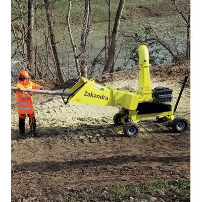 Drum chipper - Cutting up to 12 cm (4,72 inch). Zakandra wood chipper is able to cut any type of plant residue, dry or wet, up to a maximum diameter of 12 cm. Zakandra offers the possibility of entering agricultural, wooded areas and easily overcome the slopes, See dimensions on “comfort”. Also available on approved road trolley and for tractor.